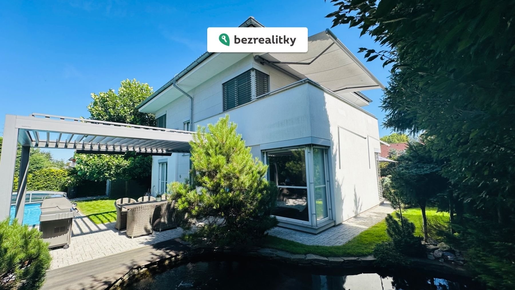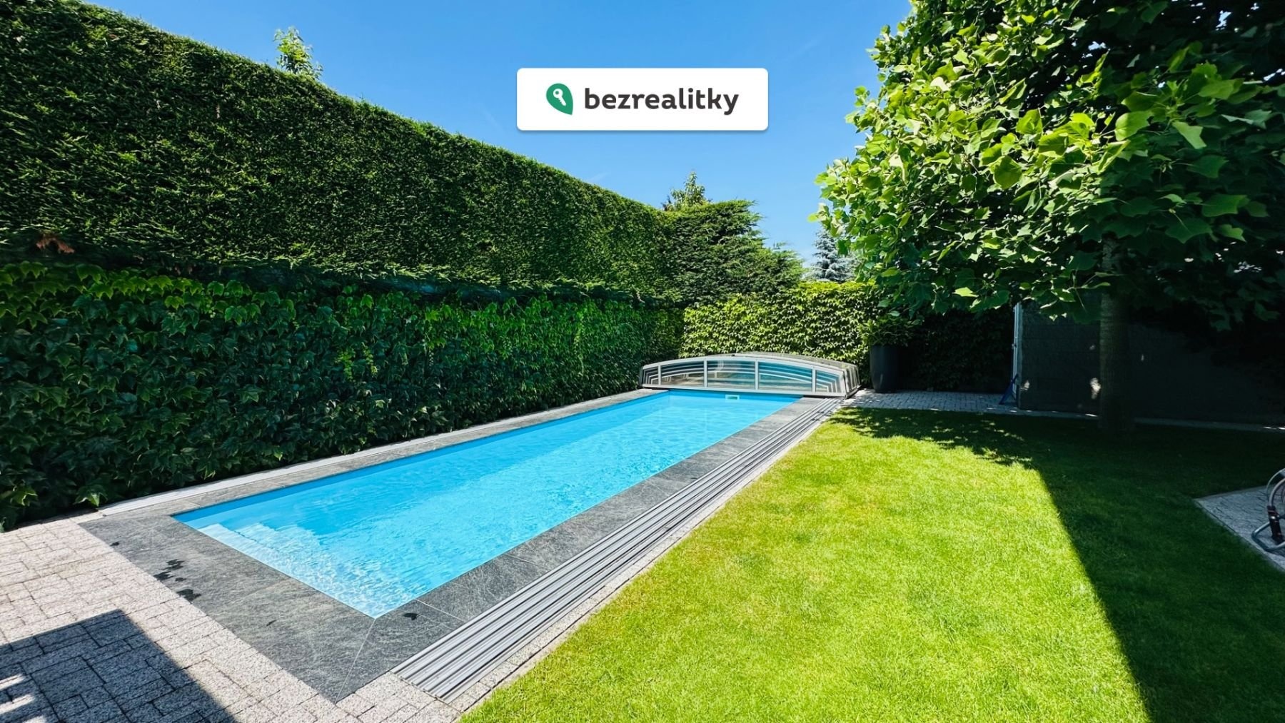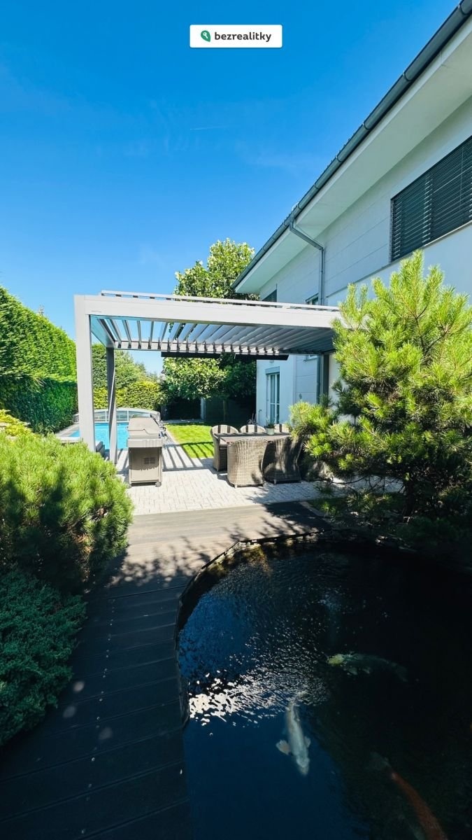 Zahrada je automaticky zavlažována (Rain Bird). Součástí zahrady je skalka, jezírko s koi kapry, bioklimatická pergola, bazén a zahradní domek. Jezírko využívá moderní technologii filtrace (Easy POD), která je snadná na obsluhu. Stejně i bazén využívá moderní technologie slané vody a technologii ohřevu vody. Bazén má elegantní zakrytí.